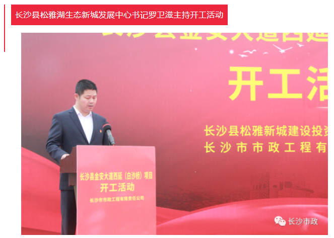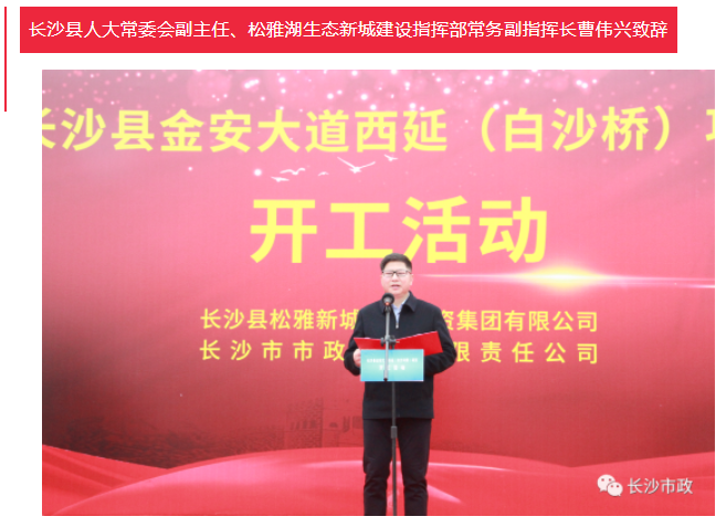 4月19日上午,長沙縣金安大道(含白沙河橋)西延項目開工活動隆重舉行。長沙市人民政府副秘書長張躍先,長沙縣委副書記、縣長、松雅湖生態(tài)新城建設指揮部指揮長陳永高,松雅湖生態(tài)新城建設指揮部常務副指揮長曹偉興,長沙市市政工程有限責任公司董事長陳懷柏出席活動。長沙縣松雅湖生態(tài)新城發(fā)展中心書記羅衛(wèi)滋主持開工活動。
